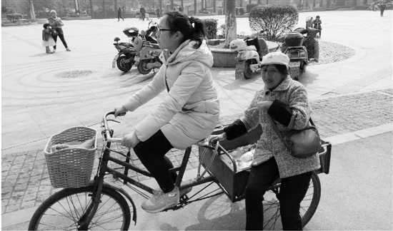 10点30分,上午班结束,万婷霞骑上三轮车载着妈妈回家吃午饭。“平时没人帮忙,我就在保洁点吃自己带去的便饭。”王雪珍说。吃过午饭,万婷霞再次载着妈妈去广场清扫垃圾。从下午1点30分工作到5点30分,下班后再次载着妈妈回家。