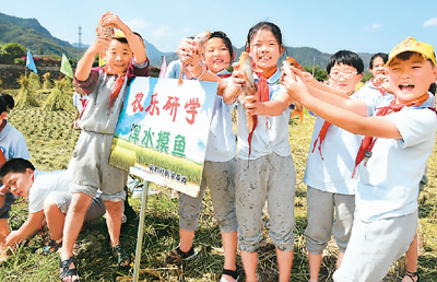 浙江省建德市三都中心小学的学生来到全国文明村——新和村研学实践基地,体验收割水稻、浑水摸鱼虾、采橘子等社会实践农事活动。宁文武摄(人民图片)