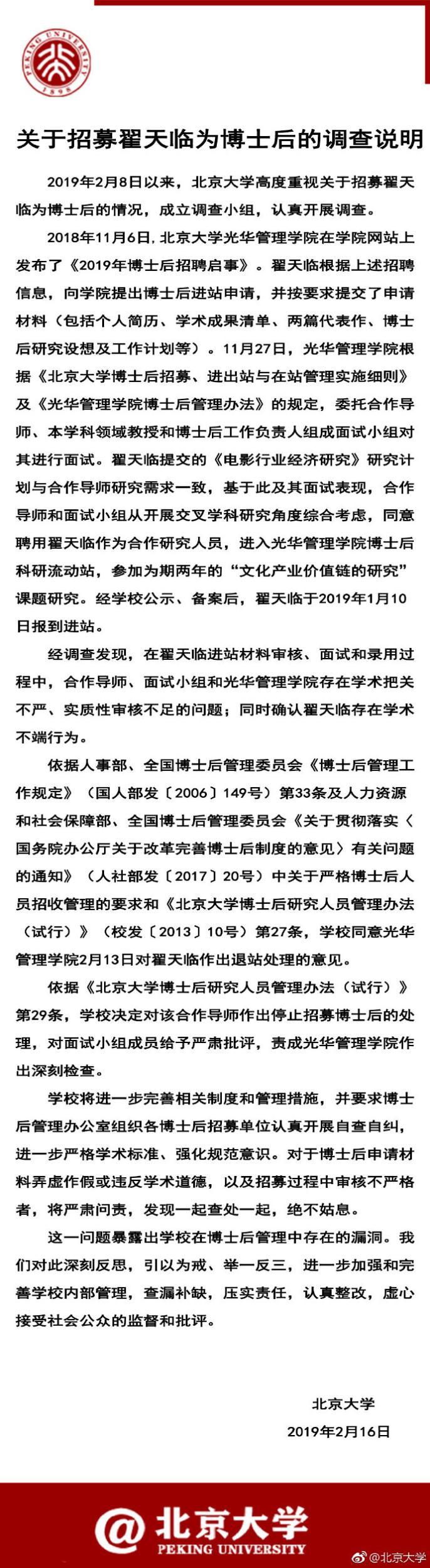 依据相关规定,北京大学同意光华管理学院2月13日对翟天临作出退站处理的意见。同时,学校决定对该合作导师作出停止招募博士后的处理,对面试小组成员给予严肃批评,责成光华管理学院作出深刻检查。(完)