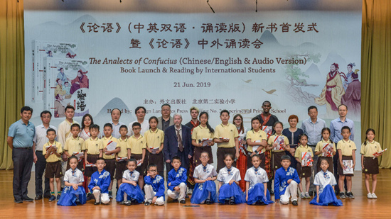 当天的首发式上,一场别开生面《论语》中外诵读会吸引了与会者关注。北京第二实验小学的学生用一幕自编、自导、自演的英文情景剧,讲述论语经典名句如何通校园文化浸润和影响学生心灵;来自北京语言大学的外国留学生则身穿汉服,用中文诵读《论语》经典名句,赢得全场热烈掌声。最后,外国留学生代表与近百名小学生一起带领全场用中英双语诵读《论语》经典名句,更将活动推向了高潮。