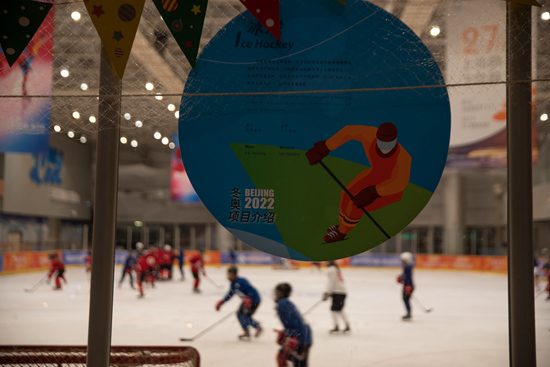 10月13日晚,北京五环外一家冰上运动中心,挡板上张贴着冬奥知识普及内容。冰雪运动因为2022北京冬奥会的临近而变得火热,北京几乎每个冰场中都出现了冬奥知识的宣传资料。