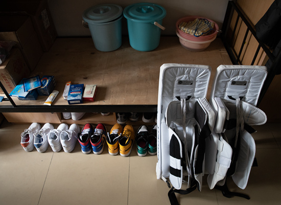 11月15日,北京大学,校冰球队队员宋喆人的宿舍,冰球守门员的护腿放在他和舍友的球鞋旁。床上还放着消肿止痛的药物和冰袋。