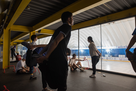 10月3日,北京五环外的一家冰上运动中心,训练结束后,人大冰球队的队员在场馆中做放松运动。