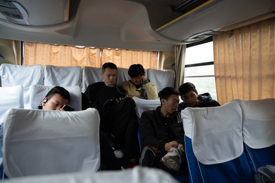 11月15日,结束最后一场比赛,北京大学冰球队队员在返校大巴车上观看比赛录像。