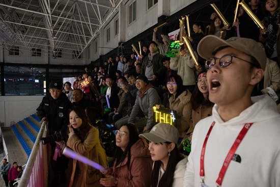 11月10日,2019中国大学生冰球锦标赛揭幕战,清华大学对战北京大学,看台一侧的清华学生为球队呐喊助威。这是本届锦标赛最受关注的一场比赛,上层看台坐满了观众。