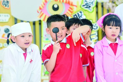 浙江湖州市长兴县开发区中心幼儿园内,孩子们在进行视力检测。吴拯摄/光明图片