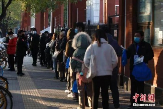 资料图:公务员考试考场外,工作人员核验考生信息。中新社记者蒋启明摄