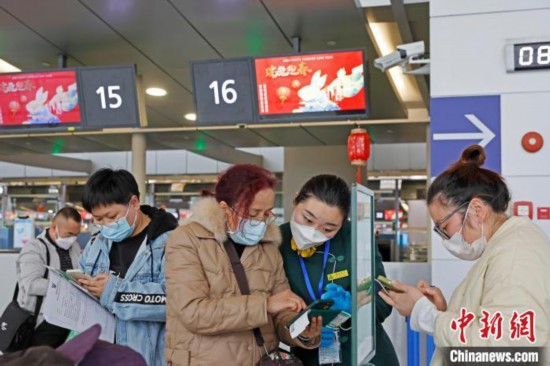 机场工作人员帮助旅客进行出境信息登记。殷立勤摄