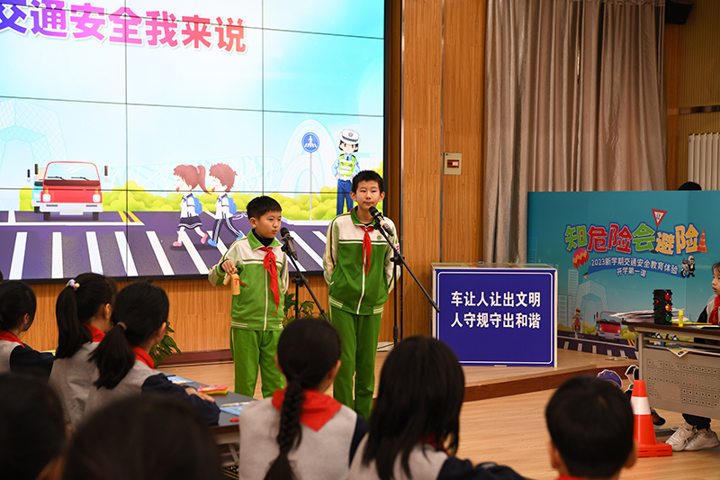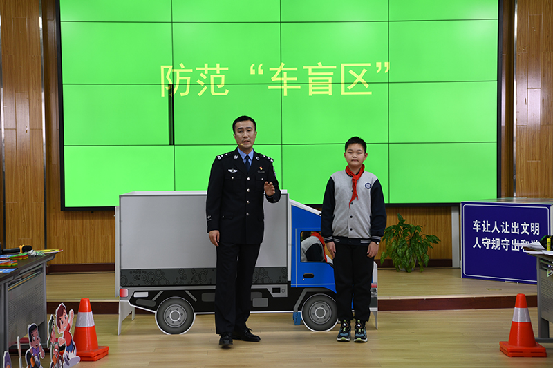 交通安全体验课上,北京市朝阳交通支队安监科民警王磊为学生们讲述了“车盲区,猛探头,开门杀”等三类乘车或走路的过程中常见的危险情况,并告诉同学们应该如何防范。王磊还邀请学生们参与交通安全演示,通过一些小的、不经意的细节,发现隐藏的安全风险,引导学生们记住交通安全常识,保护好自己的出行安全。