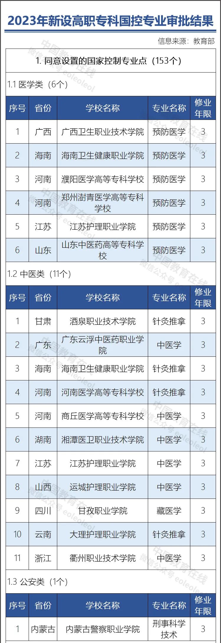 据介绍,教育部共受理2023年拟新设国控专业点申请328个,经会同公安部、司法部、国家卫生健康委、国家中医药管理局等行业主管部门审核,同意设置专业点153个,不同意设置专业点173个,需实地评估专业点2个(评估结果另行通知,合格后方可招生),审批结果可在教育部政务服务管理平台(网址:http://gz.moe.gov.cn)查询。审批同意设置的国控专业将导入全国职业院校专业设置管理与公共信息服务平台,自2023年起可以招生。