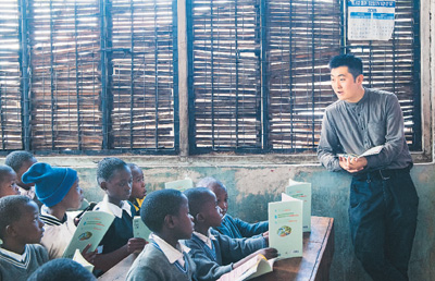 图为近日,在肯尼亚内罗毕马萨雷贫民区的一所小学,刘宜孟翰为孩子们讲解书本内容,引导他们加强阅读、爱上读书。